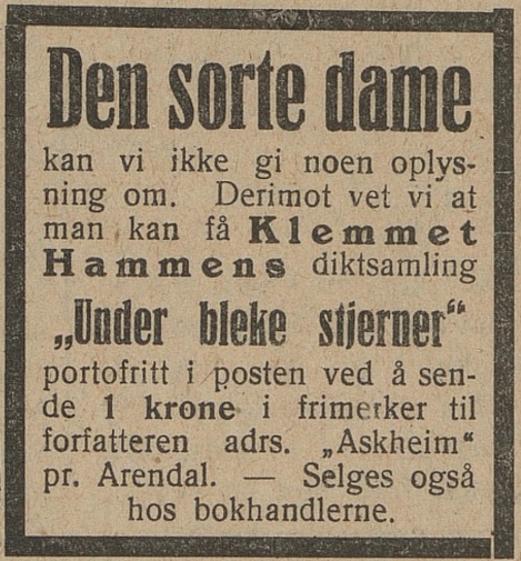 Det fantes ikke grenser for hva han kunne skrive dikt om. Med ett unntak: Jeg har ikke funnet et eneste dikt om far Ole, som ble rammet av psykisk sykdom og døde da Klemmet var åtte år. Det eneste jeg har funnet er følgende linjer i et slektsdokument han skrev, som ligger på KUBEN museum og arkiv i Arendal: